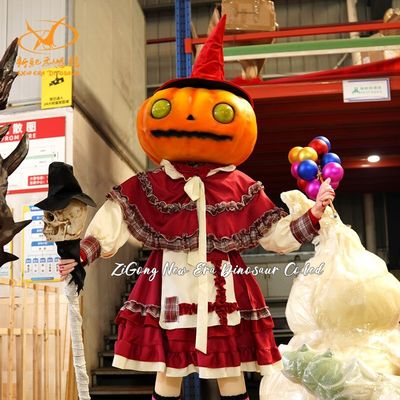Diese fesselnde Figur verkörpert eine surreale Verschmelzung von Mode und festlicher Kunst. Im Mittelpunkt steht ein gigantischer Kürbiskopf, leuchtend orange mit übertriebenen grünen Augen und einem genähten Grinsen, gekrönt von einem leuchtend roten zaubererartigen Hut. Die Kleidung ist ein sorgfältig gefertigtes rotes und cremefarbenes Lolita-Kleid mit Rüschenstoffen, Karomustern und einer großen Schleife an der Taille, das von Vintage inspiriertes Süßes mit subtilen Gothic-Untertonen verbindet.